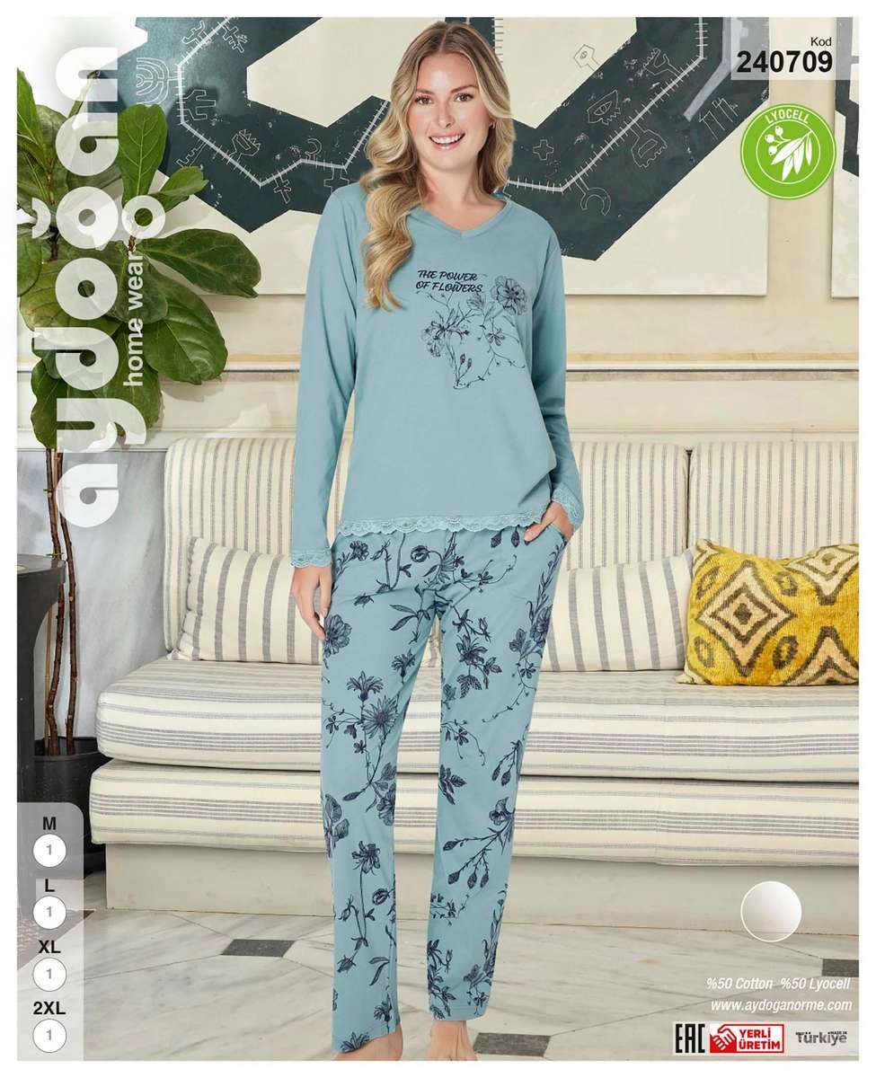 Комплект трикотажный: однотонная футболка c V-образной горловиной, длинным рукавом и отделкой кружевом, брюки свободного кроя с цветочным рисунком.
