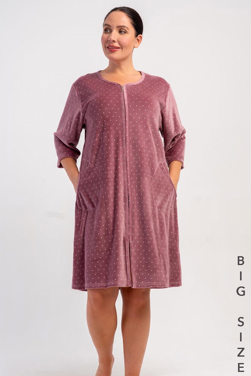 Уютный домашний халат на молнии из мягкого велюра приглушённого розово‑сливового оттенка с мелким светлым горохом. Свободный прямой крой длиной до колена обеспечивает комфорт и не стесняет движения, округлый вырез горловины и рукава 3/4 визуально стройнят силуэт. По бокам — удобные накладные карманы для мелочей. Идеальный выбор для дома и отдыха, особенно в прохладное время года.