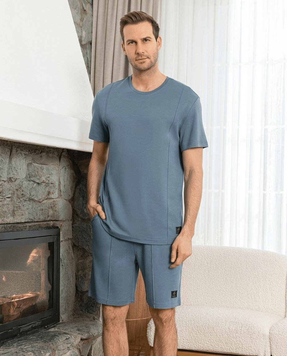 Мужской комплект для отдыха из мягкого трикотажа с добавлением бамбукового волокна выполнен в спокойном голубом оттенке и состоит из футболки и шорт. Футболка прямого кроя с круглым вырезом и короткими рукавами обеспечивает свободу движений и комфорт в повседневной носке. Шорты длиной до колена имеют свободный силуэт и эластичный пояс, удобно сидят на фигуре и не сковывают шаг. Однотонный минималистичный дизайн с аккуратными декоративными строчками делает набор универсальным вариантом для дома, отдыха и неспешных прогулок.