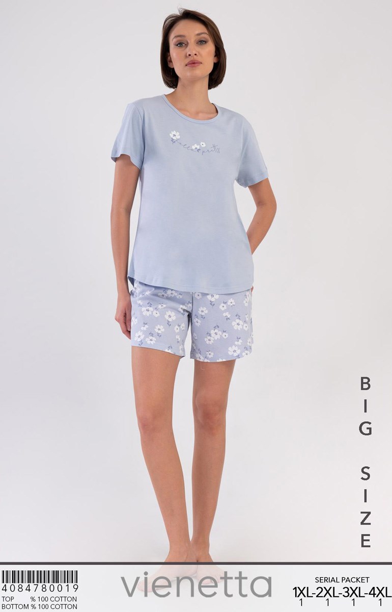 Комплект трикотажный: однотонная футболка c надписью и свободные шорты с цветочным узором.