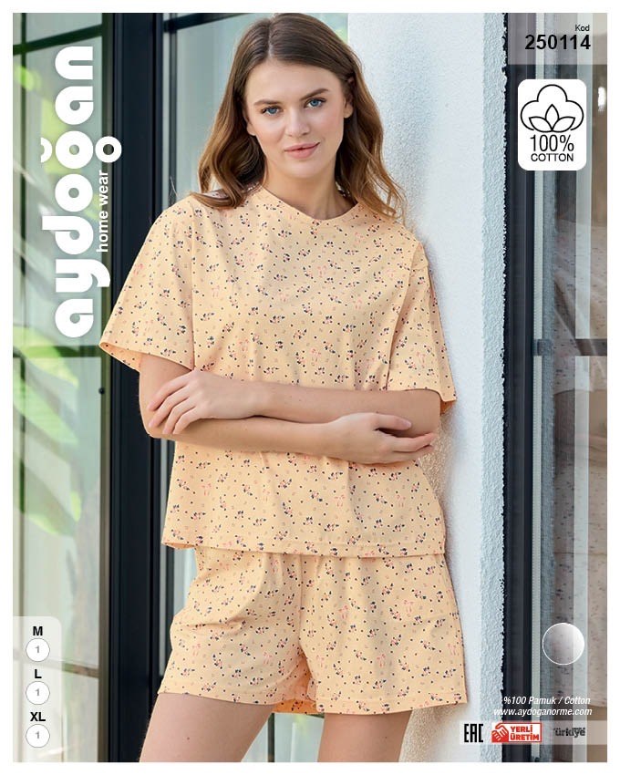 Комплект из хлопкового трикотажа, состоящий из свободной футболки и шорт с карманами на широкой резинке.