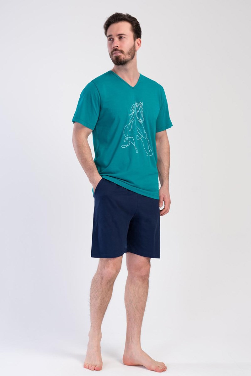 Комплект мужской трикотажный: однотонная футболка V-образным вырезом и принтом символа года на груди и свободные тёмные шорты с карманами.