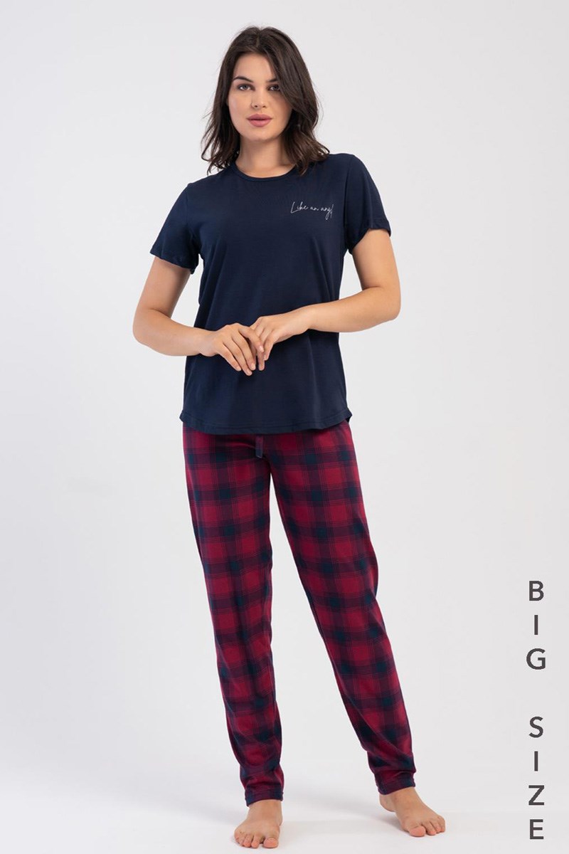 Трикотажный комплект большого размера. Однотонная футболка с принтом и свободные брюки в клетку.
