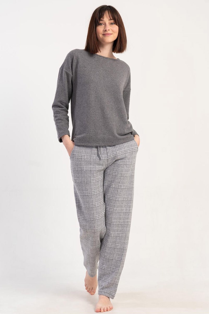 Костюм для отдыха из мягкого ворсистого трикотажа. Однотонная кофта и брюки в клетку с карманами.