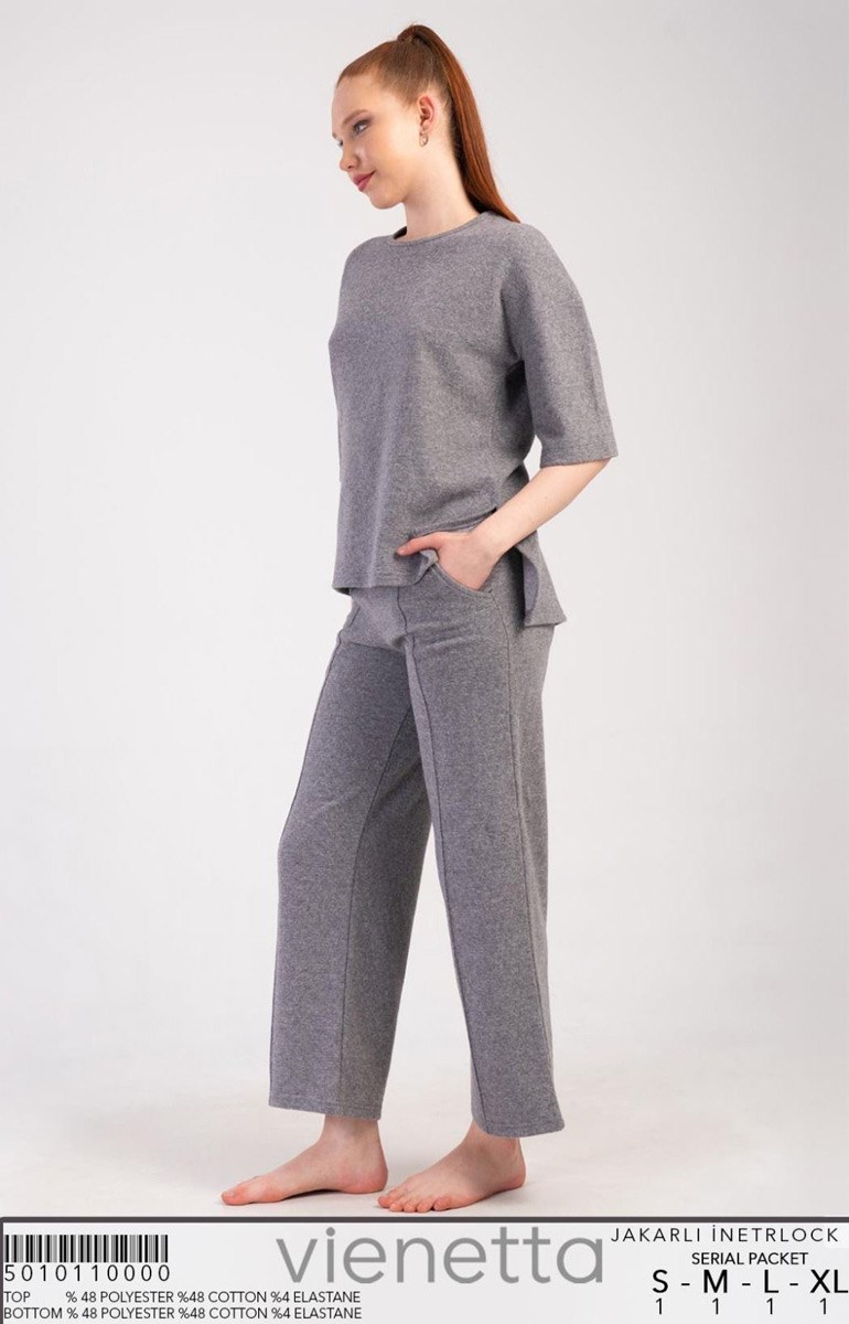 Костюм для отдыха из мягкого ворсистого трикотажа. Кофта с коротким рукавом и свободные брюки с карманами.