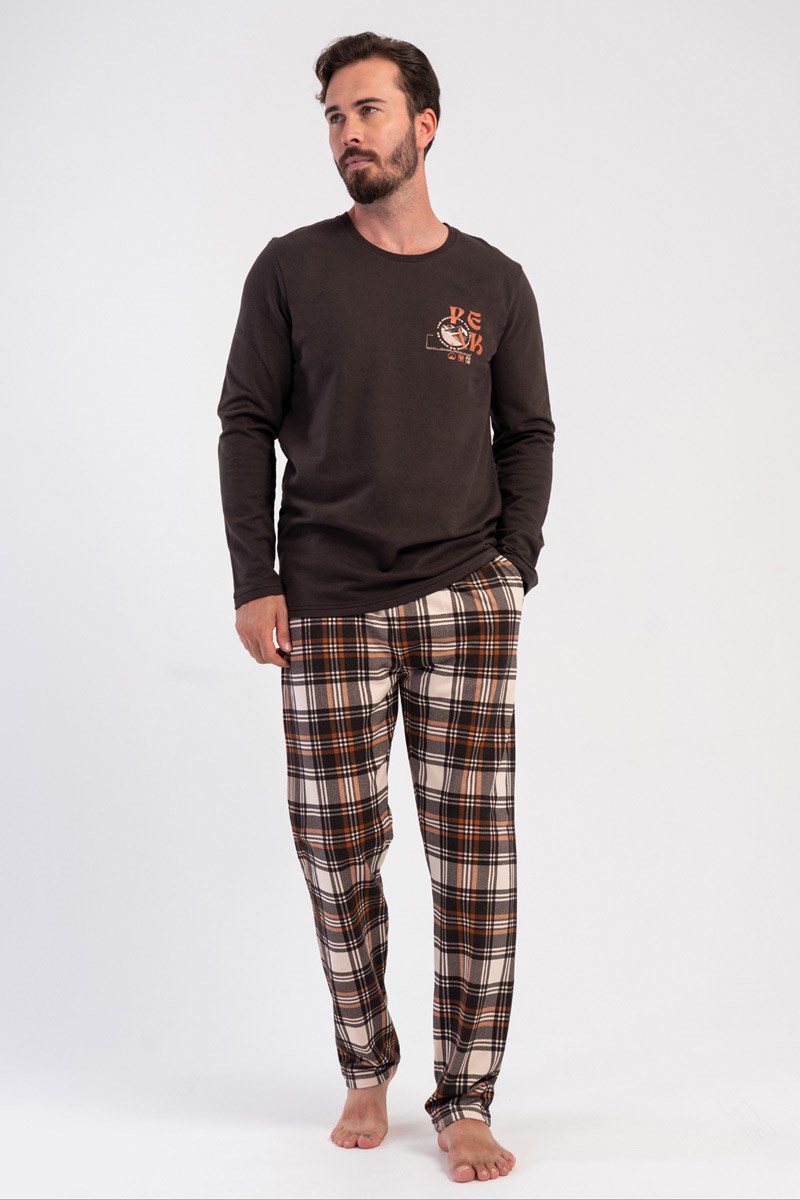 Комплект мужской на байке (с начёсом), однотонная кофта с длинным рукавом и круглым вырезом, свободные брюки в клетку с карманами.