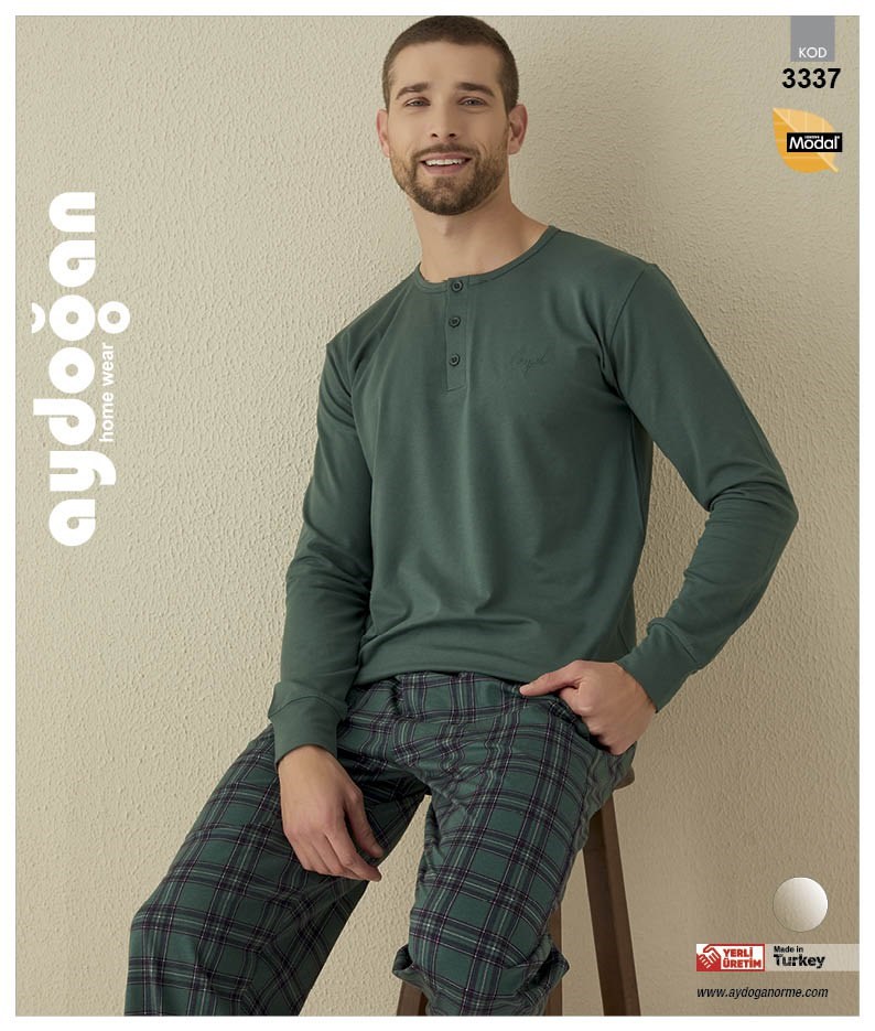 Стильный мужской комплект состоит из однотонной футболки с длинным рукавом и брюк в клетку. Костюм для дома не оставит равнодушными представителей сильного пола. Актуальная на все времена кофта с круглым вырезом и застежкой по горловине на пуговицы. Удобные брюки с карманами свободного кроя из мягкого трикотажа. Кофту и брюки можно носить как отдельно, так и сочетать с другими вещами из гардероба. В этом костюме можно провести вечер с друзьями в домашней обстановке или отдохнуть с любимой книгой. Домашняя одежда Aydogan самый продаваемый бренд в Турции с 1972 года и сделана из качественного материала.