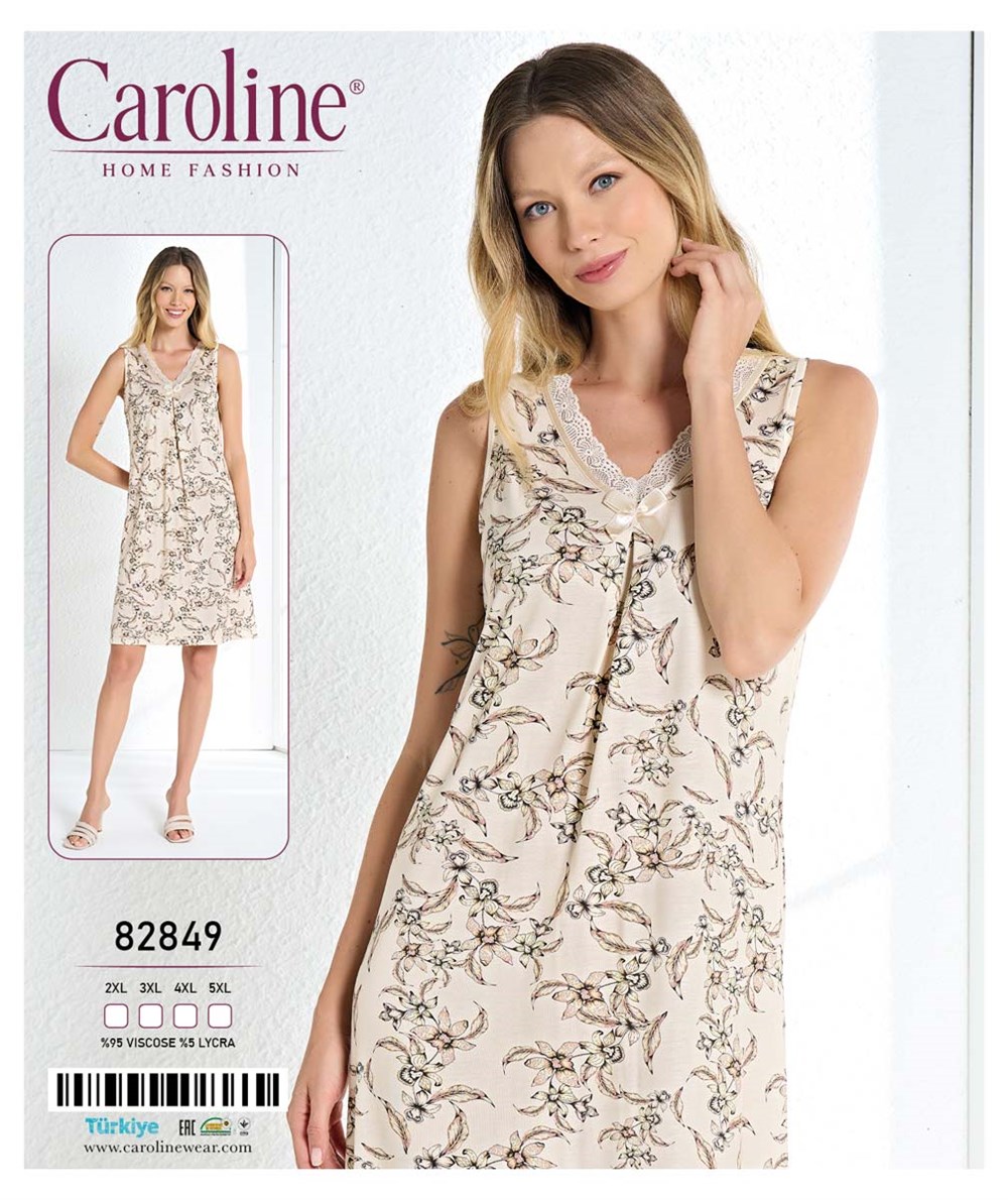 Женская трикотажная ночная сорочка из вискозы выполнена в нежном бежевом оттенке с изящным растительным принтом в пастельных тонах. Модель без рукавов, длиной выше колена, имеет свободный, слегка расклёшенный силуэт, обеспечивающий комфорт и свободу движений. V‑образный вырез горловины украшен фигурной кружевной отделкой в тон и небольшим декоративным бантиком, подчёркивающим зону декольте. Лёгкая драпировка спереди добавляет изделию аккуратный объём и делает посадку особенно удобной, что делает эту сорочку отличным выбором для сна и домашнего отдыха.