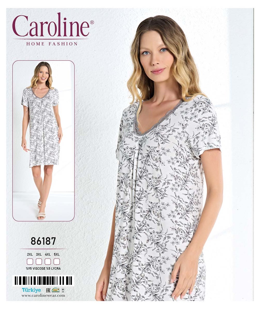 Женская ночная сорочка свободного кроя длиной до колена выполнена из шелковистого трикотажа с нежным светлым ажурным принтом по всей поверхности. Модель с короткими рукавами и фигурным вырезом горловины, оформленным контрастной тёмной вставкой и аккуратной кружевной отделкой, подчёркивающей зону декольте. От линии выреза спускаются мягкие складки, создающие лёгкую драпировку и обеспечивающие комфортную посадку по фигуре. Лёгкая ткань и расслабленный силуэт делают сорочку удобным вариантом для сна и домашнего отдыха.