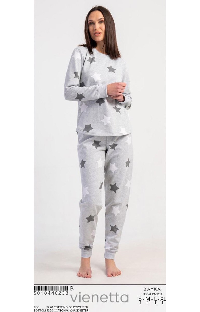 Пижама из х/б трикотажа на байке (с начёсом). Кофта с круглым вырезом горловины, брюки с манжетами на щиколотках.